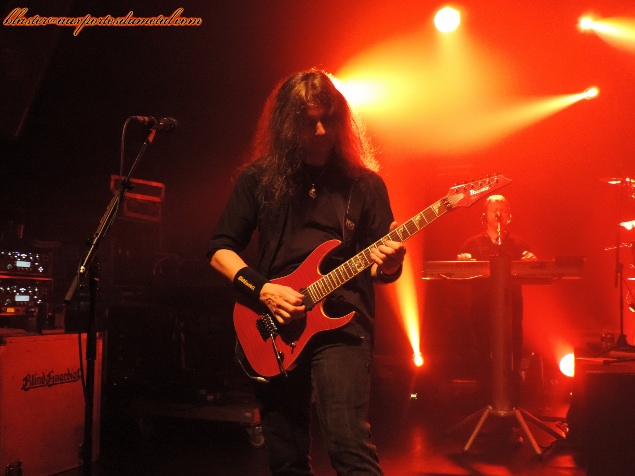 Le show début avec The Ninth Wave, chanson qui ouvre le dernier opus du gardien aveugle. Avant toute chose, une petite remarque personnelle qui vous permettra de mieux comprendre mon avis. Contrairement à Florent qui a chroniqué Beyond The Red Mirror, je n'adore pas l'album en question. Blind Guardian reste un groupe pour lequel j'ai un immense respect, j'admire leur carrière et une bonne partie de leur discographie... mais là où mon estimé collègue a entendu quelque chose qui relevait du 17/20, je n'ai ressenti que du 13/20 à tout casser. Oui, cette révélation n'est pas des plus cruciales mais ça pose le décor... il fallait que cela soit dit. Je ne m'étends pas, je ne vais pas refaire la chronique de l'album. Mais voilà, le show commence avec The Ninth Wave... un titre intéressant et ambitieux s'il en est. Sauf que je trouve qu'il a du mal à faire décoller l'opus dont il est extrait et c'est tout naturellement que je ressens la même chose pour ce qui est du début de ce concert. C'est sympa, mais ça ne prend pas complètement. Et en plus, manque de bol, la compo dure dans les neuf minutes... Je parle pour moi, vous l'avez compris... J'observe le public autour de moi, beaucoup ont l'air conquis. En attendant patiemment la deuxième chanson, je prends des photos et constate quelques petits changements par rapport au show de l'Elysée Montmartre en 2010. Un nouveau bassiste déjà, Barend Courbois. Discret mais efficace et en plus, le monsieur apporte sa contribution en participant aux choeurs (tout comme le claviériste Michael Schüren). L'amélioration notable par rapport au dernier passage des bardes dans la capitale, c'est le son. Franchement médiocre (et je suis gentil) la dernière fois, il est ce soir bien plus équilibré... Voilà qui est rassurant. Comme j'aime bien chipoter, je dirais qu'il est même très bon mais que la batterie est encore un chouilla trop en avant par rapport aux guitares. Rien de grave, les conditions sont bel et bien réunies pour que l'on savoure la musique sans gêne.