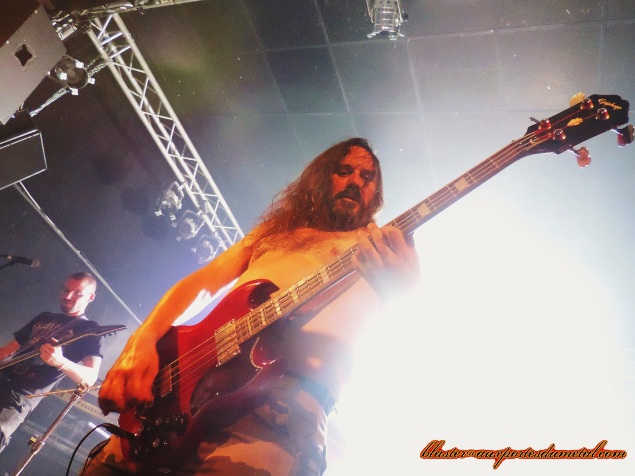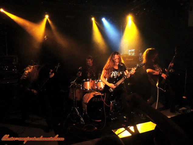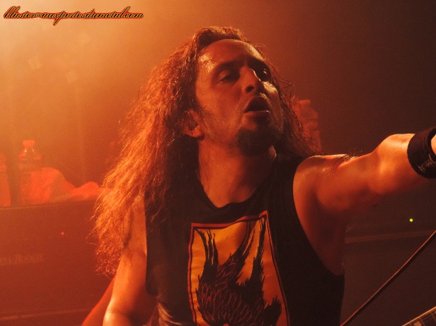 Alors, Malemort, c'est quoi ? Eh bien... difficile à dire. Leur metal est assez varié, à mi-chemin entre thrash, punk et d'autres choses (un morceau démarre avec une intro tribale assez originale, un peu plus tard, un autre sonnera beaucoup plus rock'n'roll), avec des textes en français. Ce qui est sûr et qui ne m'a pas échappé, c'est que c'est pêchu. Et les gars se donnent avec conviction. Bonne attitude, musiciens compétents, chanteur qui communique bien avec le public... tout cela passe comme une lettre à la poste. Le son est fort, puissant, un peu bordélique... la grosse énergie dispensée par les musiciens nous emporte et on se dit que, décidément, il fait très chaud ce soir (et ce n'est que le début). Entre deux morceaux, le chanteur nous dit qu'un putain de groupe de thrash est en ville ce soir, il évoque le Big 4 du thrash en précisant que s'il s'agissait d'un Big 6 ou Big 7, on pourrait y ajouter des groupes comme Testament, Exodus... et Death Angel quand même (beau joueur). Il manifestera aussi son soutien au Rock Fort Show (la fameuse émission de radio menacée de disparition) et nous incitera à nous mobiliser... sans oublier de gueuler un beau et sincère "Vive le peuple du metal". Tout cela se termine avec une reprise très énergique du Last Caress des Misfits. Un moment très sympa !