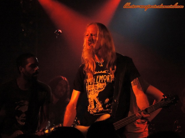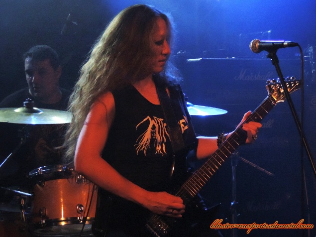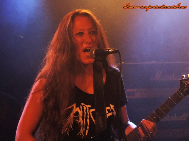 Ce n'est pas un frontman mais une frontwoman qui sévit chez Witches... Et elle fait dans le chant guttural. On en voit de plus en plus, des femmes, se frotter à ce type de chant... mais Sibylle - puisque c'est ainsi qu'elle s'appelle - ne vient pas de s'y mettre. Je me fais expliquer par une jeune femme dans l'assistance (qui connaît le groupe bien mieux que moi) que Witches a été formé dans les années 80 (j'ai vérifié, c'est 1986 exactement) et qu'il s'agit du premier groupe en France à compter une chanteuse qui fait dans le growl. Et la prestation est agressive et parfaitement carrée. Rien à redire, ça dépote. Les musiciens sont tous au taquet (rien ne déborde, tout est en place) et Sibylle décoche des riffs assassins en même temps qu'elle hurle... Le public reçoit cette prestation comme il se doit. Et là, vous vous demandez s'il fait toujours chaud... Oui, à crever !