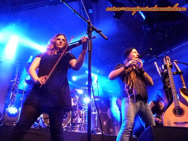 Les Suisses, qui en sont à leur troisième passage à Rennes en quatre ans, sont visiblement attendus par un bon paquet de fans. Eluveitie aime la Bretagne, la Bretagne le lui rend bien. Chrigel n'en finit plus de remercier le public. Par contre, il essaye de lancer quelques circle pits qui ne prennent pas vraiment (du moins, d’où j’étais, je n’ai rien vu, mais il ne m’a pas semblé que ça bougeait des masses…) Si le son n’est pas optimum (on entend bien les instruments traditionnels mais un peu moins les guitares), le light show, lui, est bien au point.