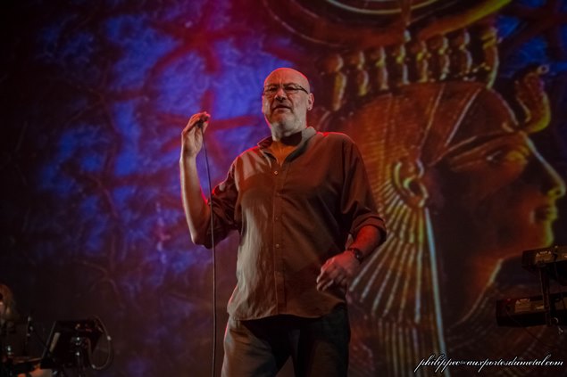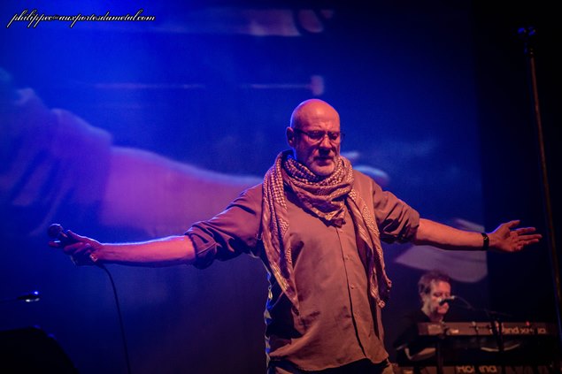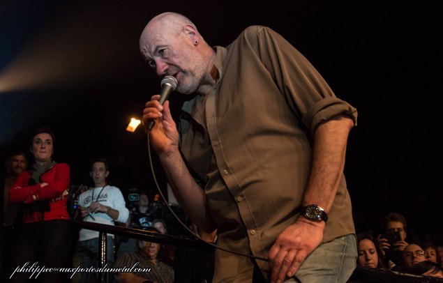 Ce passage historique terminé, je remonte dans les gradins. Sur l'écran s'affiche un gars accoudé à un comptoir avec un cocktail à la main. Sous de riches applaudissements, Fish nous annonce Slainthe Mhath, un titre qui nous renvoie fin des années 80, au dernier album de Marillion avec Fish au chant. Enfin le Lino Ventura se lève, même si on entend par-ci par-là quelques râleurs mais on s'en fout ! Beaucoup de fans étaient ados quand ce titre est sorti et dès les premières notes, nous avons retrouvé notre jeunesse d'antan, on reprend en choeur avec lui "Take it away, take it away, take it away, Take me away, take me away, take me away". Un grand moment qui ne sera pas le dernier. Sur Vigil, le titre suivant extrait de l'excellent Vigil In a Wilderness of Mirrors, Fish descend de scène et vient au contact de son public, serrant des mains au premier rang puis, tout en chantant, il se lance dans l'ascencion de l'escalier central du théâtre, micro en main, une longueur de fil impressionnante, et traverse la salle. Le géant écossais s'arrête à mes côtés, je lui serre la main puis il se met à chanter là, devant moi. Mon gun (mon reflex) sur les genoux j'ai pu immortaliser ce moment qui dure pratiquement toute la chanson, pour le plus grand plaisir de ses fans, c'est à dire nous !