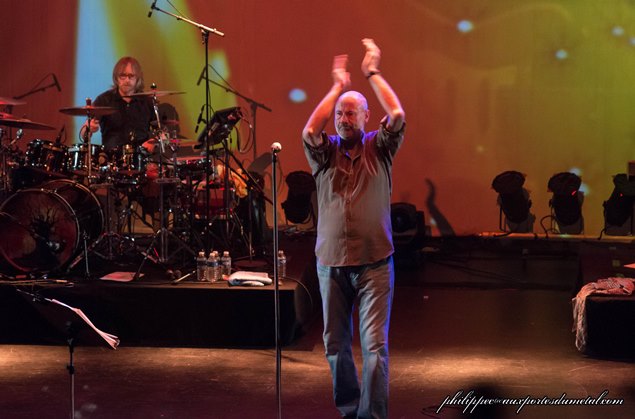 Après ce bain de foule, les musiciens enchaînent sur l'entraînant Big Wedge, extrait du même album que Vigil. Une partie du public commence à descendre devant la scène. L'ambiance atteint son paroxysme quand, sur l'écran, on voit un enfant jouant du tambour, nous renvoyant trente ans en arrière à l'album Misplaced Childhood... Là, le devant de scène est plein et tout le Lino Ventura est debout pour danser et chanter sur Hearth Of Lothian ! Fish nous applaudit et serre encore quelques mains et sort de scène... Puis revient après quelques "encore, encore" et des "oh, oh, oh !" venant de notre part. L'air joué est familier, "Ouha! Ouha !" c'est Incubus une chanson culte tirée de Fugazi (deuxième album de Marillion). Ce titre me renvoie dans la pinède de Juan les Pins, 28 ans en arrière, un 14 juillet ! Vu le délire dans le théâtre, je pense que beaucoup de fans y étaient aussi ! Fish a vraiment l'air touché par l'ambiance du public sur ce morceau ! Sur The Compagny qui sera vraiment le dernier titre de la soirée, il mime une danseuse classique puis nous demande de faire de même. Des dizaines de fans se retrouvent à faire la ballerine devant la scène ! C'est l'heure des adieux, le théâtre fait une longue standing ovation en hommage à Fish et ses musiciens. Ils nous ont offert un magnifique show ! Tout y était : son, imagerie, lumières, émotion, énergie... Nostalgie !