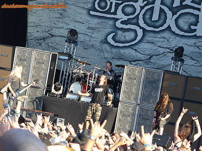 Mais je ne suis pas au bout de mes bonnes surprises du vendredi, car sur la Mainstage 2, c’est au tour de Godsmack d’attaquer son set. J’avoue que je me suis penché sur ce groupe une semaine avant le Hellfest quand mon interview a été confirmée. Avant ça, je ne connaissais absolument pas. Et pourtant, en faisant quelques recherches, je découvrais que le groupe avait vendu 20 millions d’albums et qu’aux US, ce sont des méga stars. Et bien je le dis de suite, j’ai adoré leur set super efficace. Le son est génial, les mecs sont de super pros. Ils ont balancé For Those About To Rock en intro, puis envoyé le single de leur dernier album, 10000hp. Ca envoie bien les watts. Le chanteur tente de faire chanter la foule mais sans trop nous préparer, et c’est un peu un fiasco, en plus il tentait de nous faire chanter des trucs assez compliqué. Raté. On crie quand même, on n’est pas des ingrats, et on organise même un circle pit à la fin du set, sympa. Le batteur est une pile atomique, le bassiste est excellent (ça sera d’ailleurs lui que j’interviewerai un peu plus tard dans la journée). Certains gros riffs rappellent un peu Metallica (ils ont d’ailleurs tourné pas mal avec eux), ça groove un max, on prend notre pied ce qui n’est évident pas toujours le cas avec un groupe dont on ne connait pas les albums (en tout cas, c’est mon cas). C’est la surprise du jour pour moi.