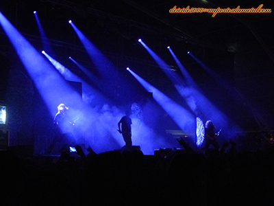 Après une petite promenade sur le site, je me trouve sous The temple pour y voir le groupe de funeral doom finlandais Shape Of Despair. C'est dans une The Temple bien remplie qu'entre le groupe. La chanteuse (Natalie Koskinen) qui porte une cape noire avec une capuche qui lui couvre la tête a des airs de grande prêtresse. Pendant les parties musicales, on la trouve à la droite de batterie, puis devant pour ses parties chantées. Le deuxième vocaliste (Henri Koivula), lui, reste devant. Tous les deux sont très statiques, il faut dire que leur musique très lente et pesante ne se prête pas trop au mouvement. Le concert prend des allures de messe funéraire, le noir est de mise, la tristesse aussi mais le public est bien présent et réceptif à la musique de Shape Of Despair. N'étant pas spécialement fan de leur style, je décroche bien vite mais les Finlandais, servis par un très bon son, ont ravi leurs fans et c'est l'essentiel. Le public, qui a eu droit à un petit "merci" de la part du chanteur en fin de set, sort content.