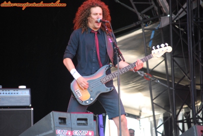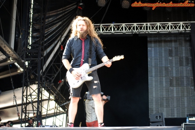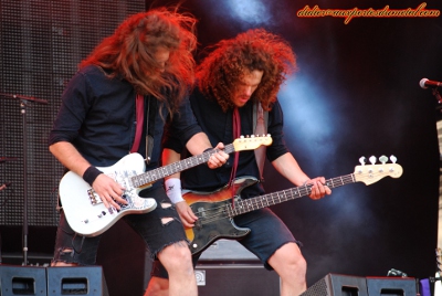 Et hop, on repart direction The Valley, le temple du stoner pour acclamer les Truckfighters, qui est un des leaders dans ce style. Je me rappelle encore de leur prestation d’il y a deux ans. J’avais été scotché. On retrouve donc le trio suédois, avec toujours Dango, le guitariste qui saute de partout en jouant, Ozo, le bassiste et chanteur qui frappe les cordes très haut sur le manche et joue pas mal en accords comme un guitariste. Quant à Poncho, il évolue sur un kit de batterie réduit au strict minimum. En tout cas, je ne suis pas le seul à avoir fait le déplacement car la tente The Valley est déjà bondée. Certains restent dehors et suivent le concert sur l’écran géant, tout en profitant du son puissant qui porte jusque-là. Ils utilisent toujours beaucoup de saturation, autant à la basse qu’à la guitare. Dango, aime bien se lancer dans des solos hystériques et Poncho a vraiment une frappe de mule. Le public apprécie en connaisseur, moi aussi.