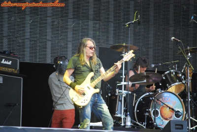 J’attendais beaucoup de ce concert, trop peut-être, car dès les deux premiers morceaux, c’est la déconfiture. Billy chante complètement faux et massacre coup sur coup, Postcard From The Past, le meilleur morceau du dernier album, et le mythique Dancing With Myself. Sacrilège ! En plus, le son est trop fort, surtout le clavier. C’est décevant, même Sodom qui jouera juste après, jouera moins fort, c’est dire ! Finalement la voix se cale correctement sur Flesh For Fantasy, il a peut-être récupéré ses retours, ou bien quelqu’un a trouvé le bouton de l’auto-tune. C’est méchant, mais je suis déçu. Steve Stevens, que j’adore, en fait des tonnes, il fait sa star, en prenant des pauses lascives, c'est plus de son âge ! Il est aussi le seul du groupe à être présenté par Billy. les autres doivent sentir le pâté... De son côté, Billy change de tenue sur scène, il fait son Johnny en prenant une guitare pour ne pas en jouer. Quand le claviériste ne joue pas, il prend une guitare, mais trois guitares c’est beaucoup trop pour jouer du Billy Idol. Je trouve le choix des morceaux pas judicieux. Par exemple, pourquoi finir sur une reprise comme Mony Mony alors qu’il a un set assez court et des tonnes de super morceaux ? Pour le rappel, ils envoient un monstrueux White Wedding dans lequel Billy fait chanter la foule, et terminent par LA Woman, une autre reprise, des Doors cette fois. Sympa, mais pas judicieux à mon avis. C’est la déception de la journée.