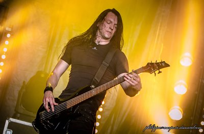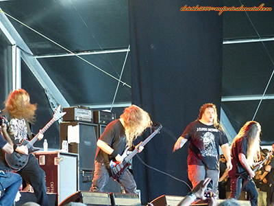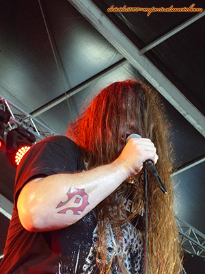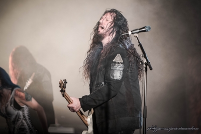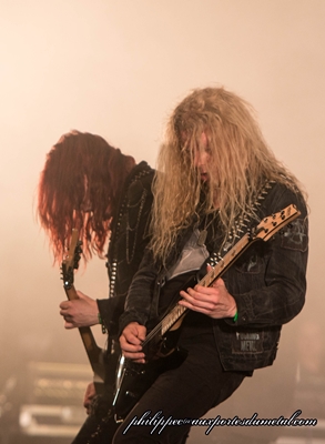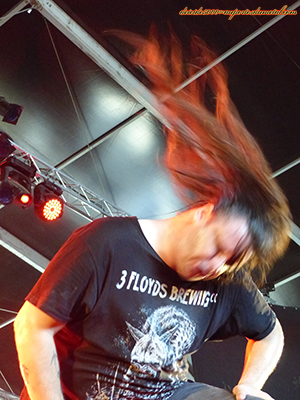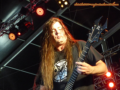 Vient le moment du concert, prêt à prendre des photos. Les "saigneurs" du death metal sont présents dans l’arène et ils sont là pour déchiqueter du metalleux. Que dire de ces grands malades tous quadragénaires, héritiers de la première heure du death metal et encore là à nous faire mal à la tête ? Ben, qu’ils font encore plus mal là où ils passent que des petits jeunes. Eh oui, ils prennent leur temps pour planter la lame dans la plaie et tourner jusqu’à obtenir le bon niveau de plaisir au thermostat optimal. Je remarque que Robb Barrett, le guitariste qui a remplacé l’autre déjanté de Jack Owen, a dû avoir une mauvaise rencontre avec une porte car il a un oeuf de pigeon proéminent sur son crâne qui se fraye un passage à travers sa chevelure clairsemée. L’exécution est parfaite. Que dire de plus d’un show de Cannibal, que c’était génial ? que c’était rythmé ? En clair, tout cela est évident. La plupart des albums sont bien représentés. Le set finit sur Devoured by Vermin, un pur bonheur.
