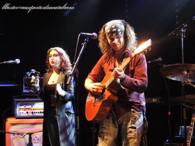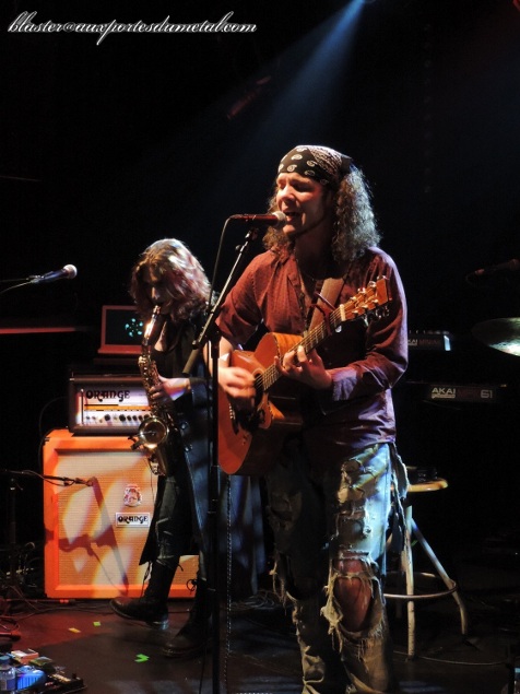 Tout a commencé avec un duo nommé Fire & Water. On n'a pas su tout de suite qu'il s'agissait d'un duo, cela dit. Un guitariste seul s'est présenté sur scène et a commencé à jouer de son instrument pour chauffer la salle. Sa dextérité à la guitare sèche s'est vite imposée à nous... mais c'est quand une jeune femme armée de son saxophone est arrivée sur scène que les choses ont commencé à être plus intéressantes. Ensemble, le duo s'est lancé dans une reprise de Led Zeppelin, Babe I'm Gonna Leave You. A la fin de la chanson, on en a su plus sur ces deux personnages. Ils viennent d'Irlande et font donc partie de Fire & Water, groupe qui contiendrait habituellement pas loin d'une dizaine de musiciens. C'est donc une version réduite de la bande qui nous est offerte ce soir. Les deux Irlandais enchaînent avec une composition originale - dont le titre m'échappe - assez enlevée, très sympa... avant de continuer avec The Shepherd, plus cool et bluesy. La voix éraillée de Tomas passe bien et cette musique folk bien exécutée par ces deux musiciens souriants est plaisante et facile d'accès.