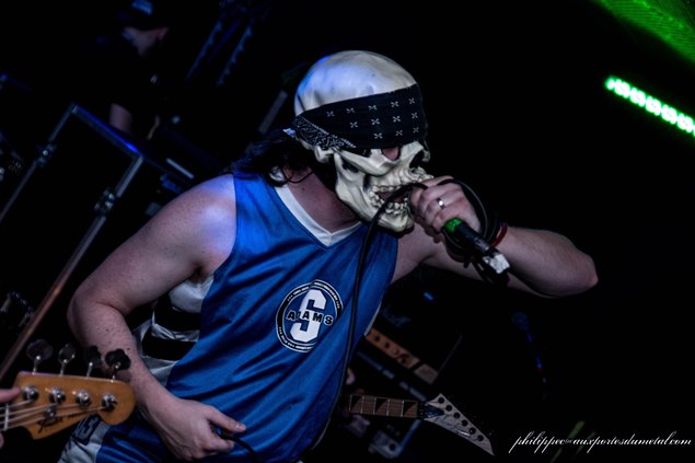 Les changements de plateau sont très rapides, juste le temps d'une mousse que voilà l'intro du set de Dr.Living Dead. Ce groupe de Thrash groovy suédois, notre chroniqueur Jojo, spécialiste du genre, les avaient croisé lors du Hellfest 2013. C'était le premier jour, les Scandinaves ouvraient le bal sur la mainstage 2 et il nous en avait dit un grand bien ! Moi, ce soir je découvre. Nos quatre toubibs masqués partent sur les chapeaux de roues avec Hard Target. DRxMania - Chant, DRxToxic - Guitare, DRxRad - Basse, DRxSlam - Batterie ne font pas de fioritures, leur musique s'inspirant de Suicidal Tendencies, Municipal Waste ou Anthrax est faite pour le mosh et le headbanging à outrance. Les multiples interventions en français de DRxMania installent une ambiance bonne enfant avec le public, tout le monde est pris par le groove émis par la rythmique de DRxRad et DRxSlam sur les brûlots comme Buck$, Suffering, Dead End Life...