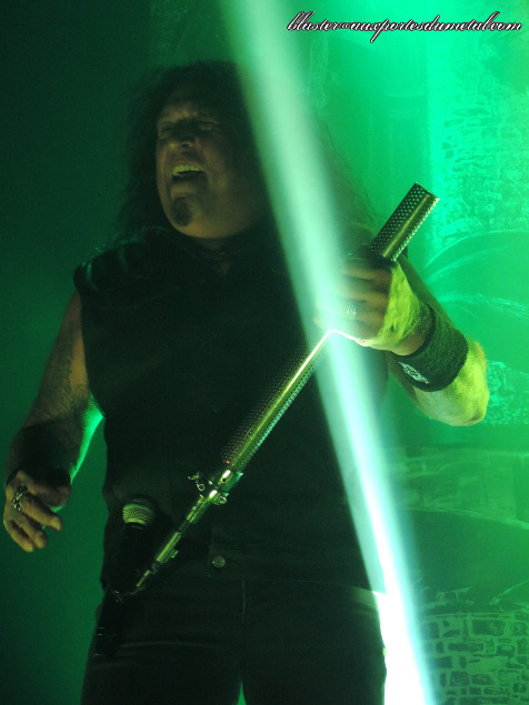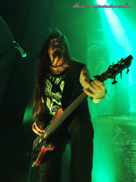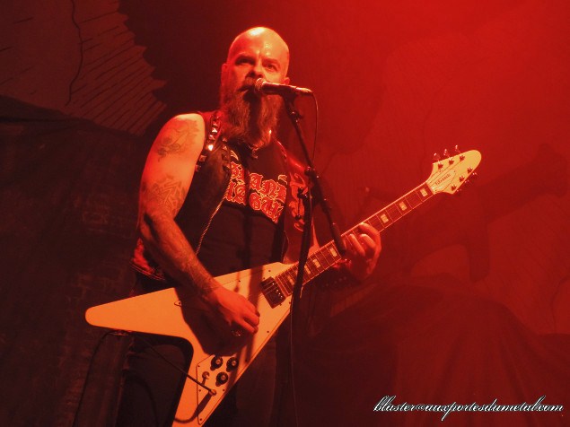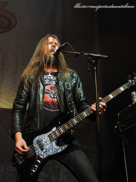 Lights pas top (c’est le chroniqueur également chargé de prendre des photos qui parle, là) avec des musiciens essentiellement éclairés par derrière (ils apparaissent donc plus en ombres chinoises qu’autre chose) et gros renforts de stroboscopes. Mais on dira que ça va bien avec le style musical du groupe, un thrash sombre et implacable. Sur Brotherhood Of The Snake, le son est absolument infâme. Heureusement, ça s’arrangera par la suite et on distinguera de mieux en mieux ce qui se passe.