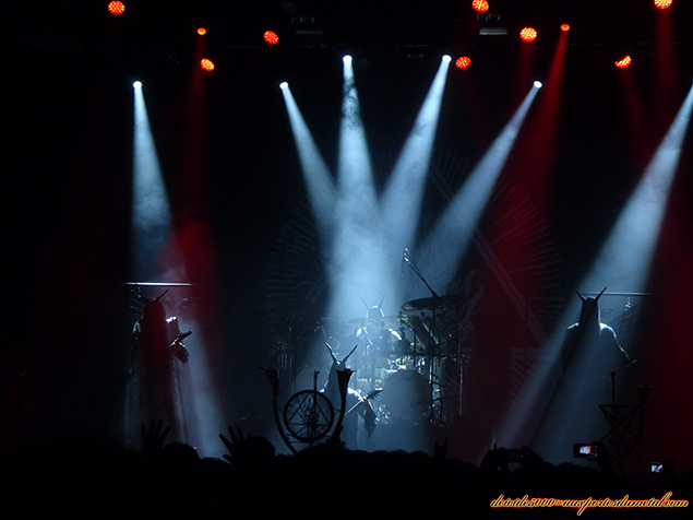 Le son est parfait, puissant, les lumières remarquables laissant le groupe dans la pénombre tout en offrant suffisamment de clarté pour découvrir le maquillage effrayant des affreux jojos. “Scream for me Toulouse”, la mise en scène est un maître mot chez Behemoth tellement on aura l’impression que tel un moine possédé, il s’adressera à ses ouailles converties pour leur servir le sermon du dimanche soir (les vêpres...). Entre un Nergal dévastateur et communicatif, un Orion aux poses effrayantes (si, si), un Seth (plus timide je trouve) et un Inferno (batterie) adepte de la marteau-thérapie (traduire : le blast à donf, go go), nul espoir d’être relâché vivant.