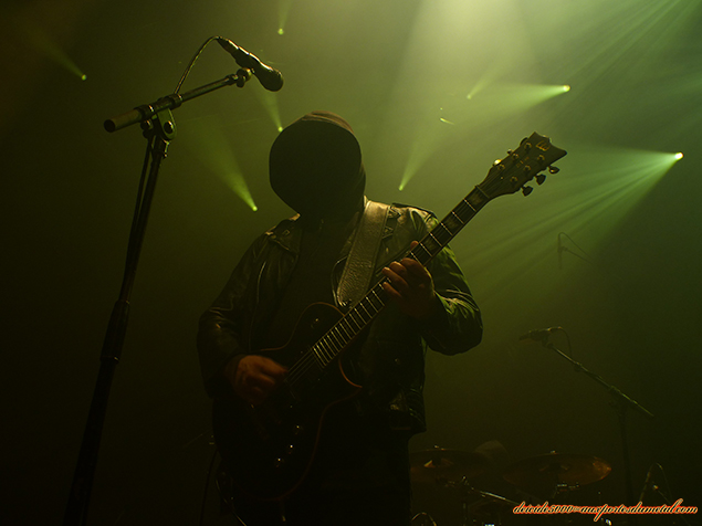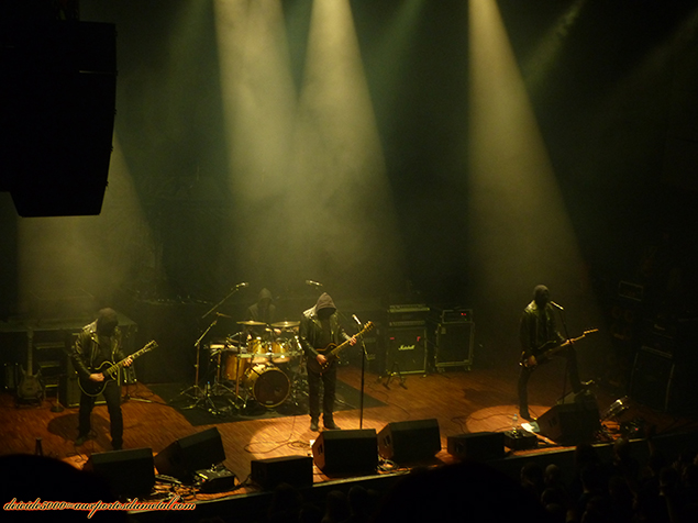 Dès 20h10, après un soundcheck rapide, c’est au tour du premier groupe polonais de la soirée MGLA, au nom imprononçable (prononcez “MGWA”, qui signifie brouillard dans leur langue maternelle). Ils sont tous vêtus de perfecto (sauf le batteur qui aurait pris une sacrée suée sinon) et encagoulés intégralement de noir, officiant dans un black (ça ne s’improvise pas) metal brutal et sans concession.