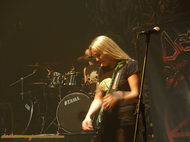 Les Nervosa ont un programme de tournée mondiale très chargé et sont en soutien de leur deuxième album, Agony. Ce sont les jolies Brésiliennes (rien que ça, ça donne envie, non ?) qui ouvrent le bal ce soir. Après les avoir vues en tête d’affiche en juillet, les voilà en entrée de soirée. En raison de l’interview avec Schmier, je vais malheureusement louper quasiment tout leur set et n’arriver que vers 19h30, à l’avant dernière chanson. Ce qui laisse tout de même deux tubes du groupe pour mon oreille.