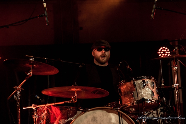 Le bon plan aussi, c’est que le matos sur lesquels ont joué les LSB est à peu près le même que celui de Devon Allman Band. On pousse un peu le piano et c’est prêt. Marco monte sur scène pour nous prévenir qu’on allait prendre une claque et qu’on fasse un max de bruit. Ce que nous fîmes. C’est le batteur du Devon Allman Band (Anthony Nanney) qui attaque les hostilités et on peut dire que ça cogne. Le son est beaucoup plus puissant que pour nos LSB. Steve Duest, le bassiste, fait son apparition et attaque une ligne qui groove sa race. On est passé à la vitesse supérieure, Marco avait prévenu et il avait raison. Par contre, les bouchons s’imposent. Devon et son second guitariste, Bobby Schneck Jr, arrivent et le concert est lancé. Si le Bobby s’appelle Junior, il a un look assez juvénile aussi, c’est surprenant. Par contre il n’est pas là juste en faire valoir à Devon. Que nenni, c’est un sacré guitariste, et lui et Devon se partagent pas mal de solos, c’est le top. Devon, joue sur une Les Paul, avec une dédicace sur le corps, que je n’arrive pas à identifier. Au final, grâce à Google (et la 3G dans la salle), je découvre que c’est Les Paul en personne qui la lui a dédicacée. Les mecs : le type joue sur une Les Paul dédicacée par Les Paul, ça parait incroyable… mais vrai. Et ça en dit un peu plus long sur le statut de ce guitariste.