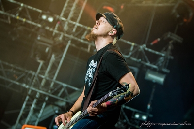 Je ne connais pas non plus Shinedown, mais comme le Hellfest sert aussi à faire des découvertes, me voilà bien calé devant la Main Stage 1 (où j'ai décidé de passer le vendredi) pour me laisser convaincre. Je dirais que le style est modern metal, avec un line up assez simple, constitué d'une guitare, une basse et une batterie, avec un chanteur. Ça bouge bien sur scène, ça saute beaucoup et donne envie de bouger à la foule. Le bassiste porte pourtant une attelle à son genou, mais ça ne l'empêche pas de sauter de partout. Lui et le guitariste assurent beaucoup de chœurs et, régulièrement, ils utilisent sur des intros, chacun leur tour, des guitares acoustiques posées sur un trépied, installées puis retirées par un roadie. C'est bien fait et leur son est excellent. Le bassiste jouera aussi sur un mini piano, en alternant basse et piano. Même si tout est fait pour être le plus vrai possible, certains claviers sont quand même samplés. Brent Smith, le chanteur, assure un super show, il fait écarter la foule en deux parties et, pour bien qu'on comprenne qu'il faut attendre trois pour lancer le wall of death, il n'hésite pas à descendre dans la foule et remonter le long du no man's land. Il remonte sur scène pour orchestrer la furia des festivaliers. Ça bouge bien, et l'unique (et premier du festival sur les Main Stages) slammeur fait son apparition. Je dois avouer que j'aime beaucoup le set et que le chanteur sait se mettre le public dans la poche : on lève le poing, on tape des mains et du coup, il nous trouve excellents et demande au cameraman d'ARTE présent sur scène de filmer plutôt le public que le groupe. Visiblement, les Américains découvrent la qualité du public du Hellfest. Pour moi, Shinedown est une belle découverte de ce vendredi.