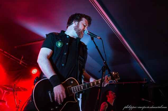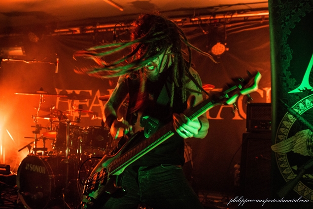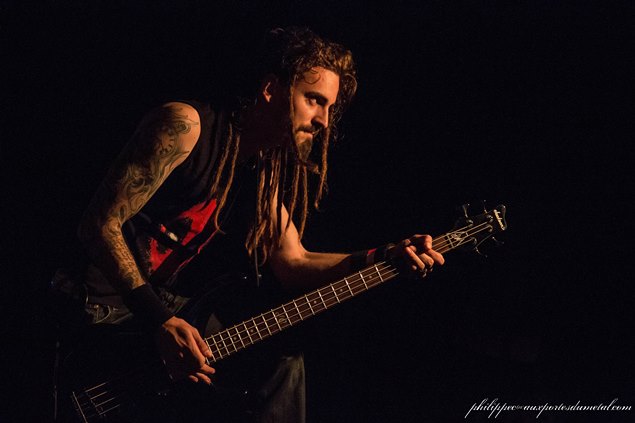 Tony à la basse (et qui a remplacé Flora en 2015) bouge beaucoup, et c'est un festival de dreadlocks en bataille autour de lui. Je pense à Phil devant qui doit se régaler, l'oeil collé à son objectif. Derrière, le jeu de batterie de Christophe est aussi brutal qu'impressionnant. Kevin branche ses potes dans la salle entre les morceaux, il explique qu'ils ont pas mal tourné et sont contents de jouer à domicile. Il demande aussi qui était présent pour la figuration dans le clip, et les trois premiers rangs gueulent : ils y étaient donc.
