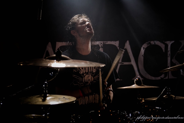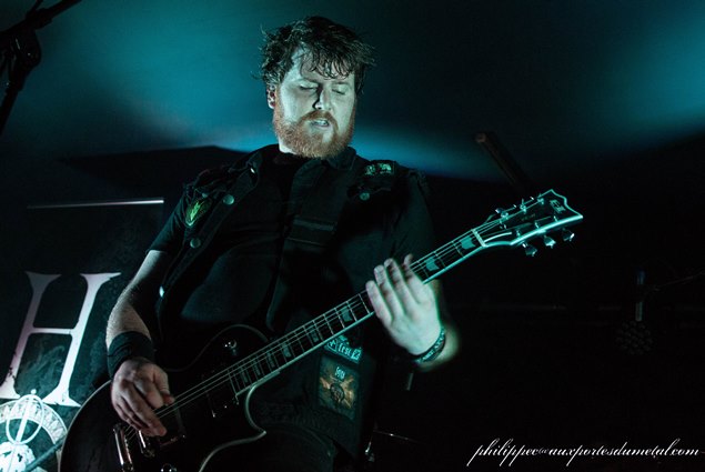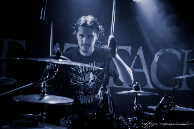 Le matos de Heart Attack est remballé assez rapidement et celui de Hypno5e installé. Ca va relativement vite car ils n'utilisent pas d'amplis sur scène. Gredin connecte sa basse (une monstrueuse BC Rich) à travers une pédale et bing ! directement sur la sono ; les deux guitares (deux superbes jumelles sept cordes de chez Schecter) sont connectées sur une tête d'ampli, sans haut-parleur, directement en sono aussi. La batterie de Théo est entièrement montée, c'est au final ce qui prend le plus de temps. Les techniciens de la salle s'aperçoivent tout à coup qu'une des enceintes de la sono crache et elle est remplacée en moins de deux minutes pour une identique. Chapeau l'organisation !