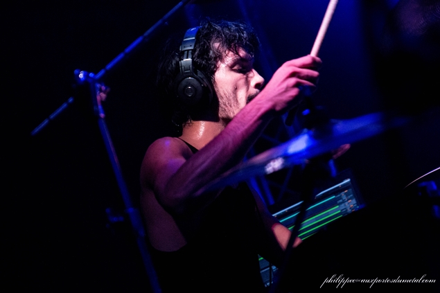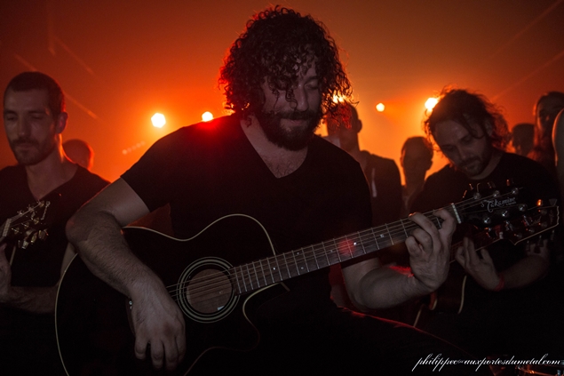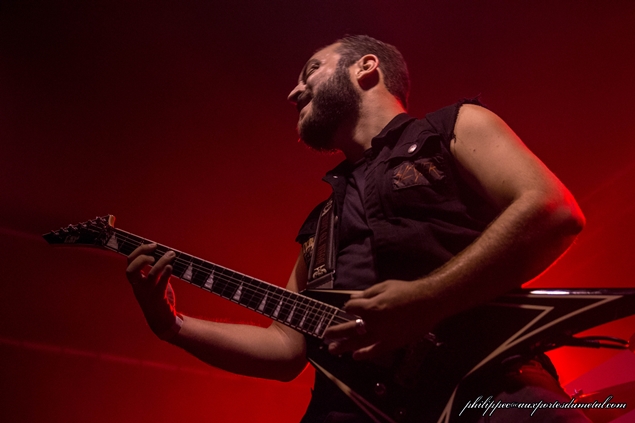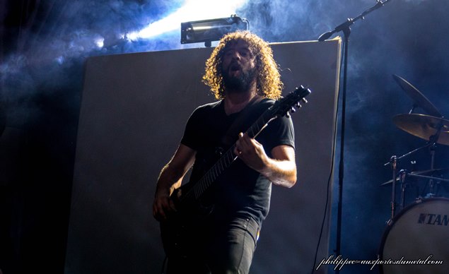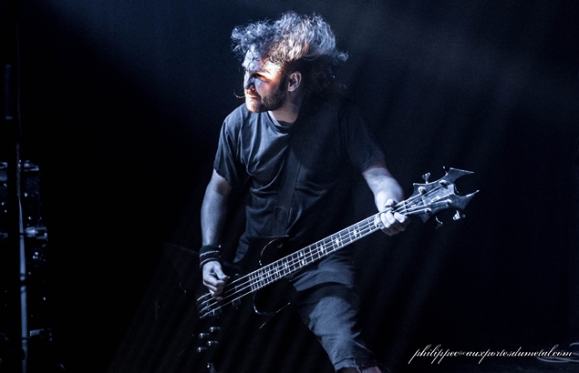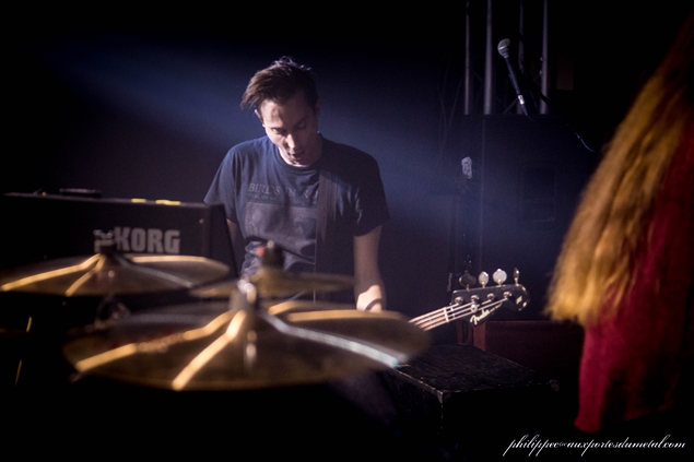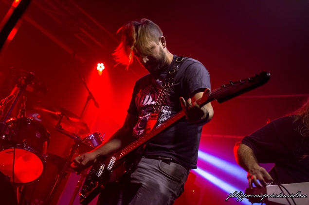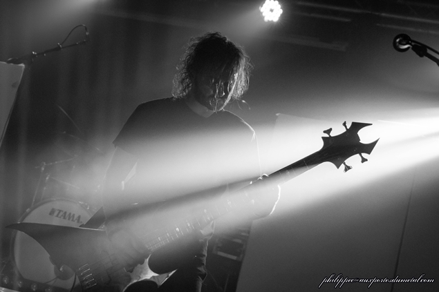 Bref, ils montent sur scène dans une semi pénombre au son des samples de l'intro de In Our Deaf Lands. Phil va encore râler après la lumière. Gredin est pieds nus, avec sa grosse basse BC Rich. Emmanuel alterne toujours les parties de chant clair, et les chant hurlé assez haut, c’est toujours aussi prenant, avec des contrastes incroyables. Je n’avais pas réalisé lors du concert de Cannes, mais Gredin chante avec Emmanuel quasiment tous les passages calmes. Emmanuel n’est toujours pas du genre à discuter entre les morceaux. Il dira juste merci à la fin : sobre. Sur un des nombreux passages djent, ils sautent tous les trois de partout, et Emmanuel se prend un bon coup de basse, et vu la forme du manche, il a dû le sentir passer : les risques du métier.
