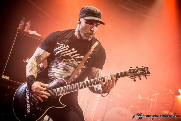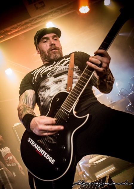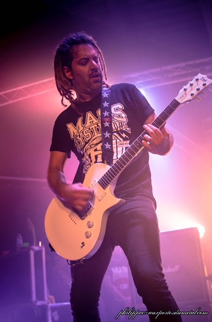 Mouss plaisante un peu entre les morceaux, mais pas trop non plus car Rapha envoie les samples des morceaux, coupant court aux long discours. Il a le temps de nous parler du latin pas mal utilisé sur les titres du dernier album, de dire qu’il est surpris de l’ambiance et que dans le Sud, on a mauvaise réputation. On crie alors, il concède qu’on a eu un coup de mou ces dix dernières années mais que ça va mieux. Il n'est pas au bout de ses surprises ce soir. Je vous confirme qu’il n’est pas utile d’avoir fait du latin au collège pour s’éclater sur Vae Soli et Vector Equilibrium. C’est l’hystérie de masse dans la salle ! Ils enchainent ensuite avec World on Fire, devenu culte depuis Failles, TBD, et là encore, la foule répond au quart de tour, notamment sur le break qui est une tuerie de plus. Mouss vient voir le gamin, lui demande son âge (on dirait l’école des fans), et le félicite pour son blouson et pour représenter l’avenir du metal. Le gamin est debout sur la scène et il saute en faisant les devil’s horns. Il s’éclate réellement et en voyant les slammers il se jette aussi de la scène et son père le rattrape limite. Plus tard, le nouveau bassiste lui file son médiator, Yann aussi, et il est tout fier. Mouss remercie la mairie d’avoir laissé organiser un concert. Il ne peut s’empêcher d’ajouter qu’elle doit être de gauche. Sacré Mouss ! Il remercie Virgil d’avoir organiser la soirée. C’est pas simple de trouver des endroits où jouer en ce moment ajoute-t-il. A ma droite je vois Philippe l’œil incrusté dans son viseur, chahuté par les pogoteurs dans son dos. Pas facile de faire le bon cliché. Mais Mouss est un sacré pro et il sait y faire, et vient se caler devant Phil, prendre des poses. Phil est aussi un sacré pro et il n’en rate pas une miette.