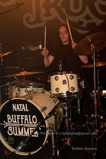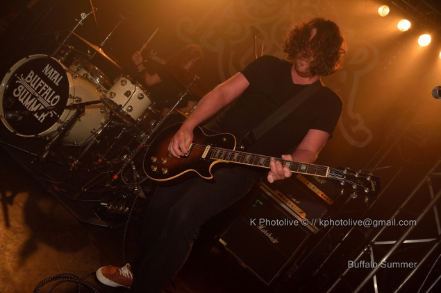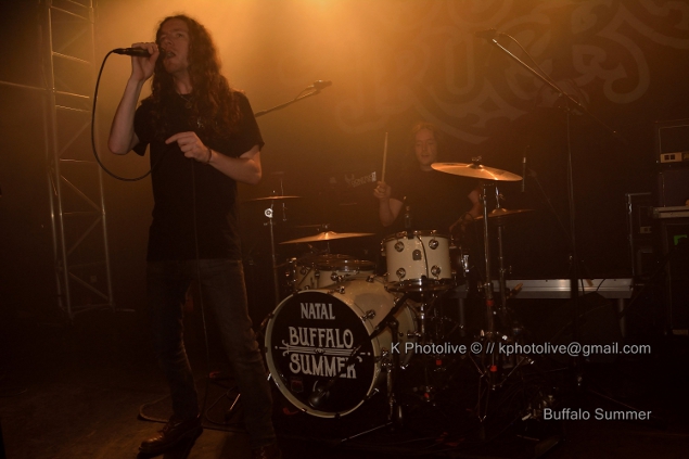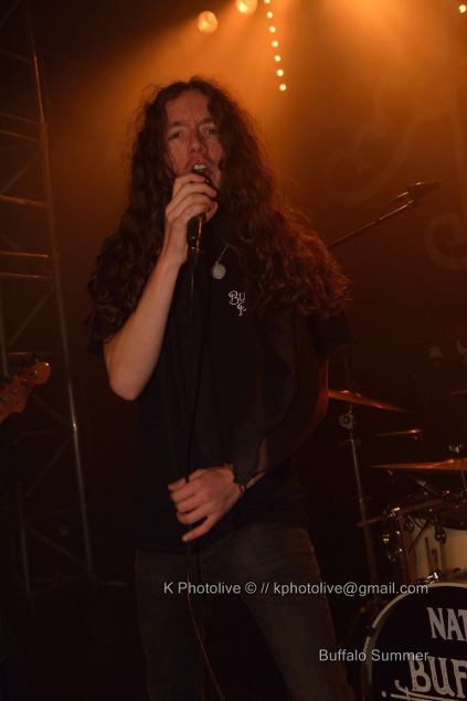 Suite à une mauvaise information d’heure de début, je rate le premier morceau de Buffalo Summer, je suis furax. Et les choses ne s’arrangent pas quand je découvre que j’ai perdu le clapet de fermeture du logement batterie de mon appareil. Résultat, je ne peux pas l’allumer. Quel idiot, je n’ai pas vérifié avant. Je remballe tout, je me calme et me concentre sur le groupe. Celui-ci est originaire du Pays de Galles, on l’entend à l’accent de son chanteur quand il annonce les morceaux. Dans ma chro de leur excellent second album, je me demandais si Andrew Hunt (chant) et Gareth Hunt (batterie) était frères, mais la chose est indéniable en les voyant sur scène : ils sont frères !