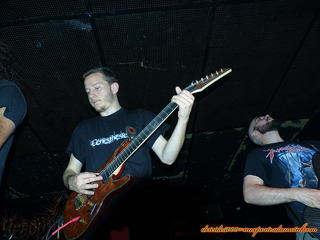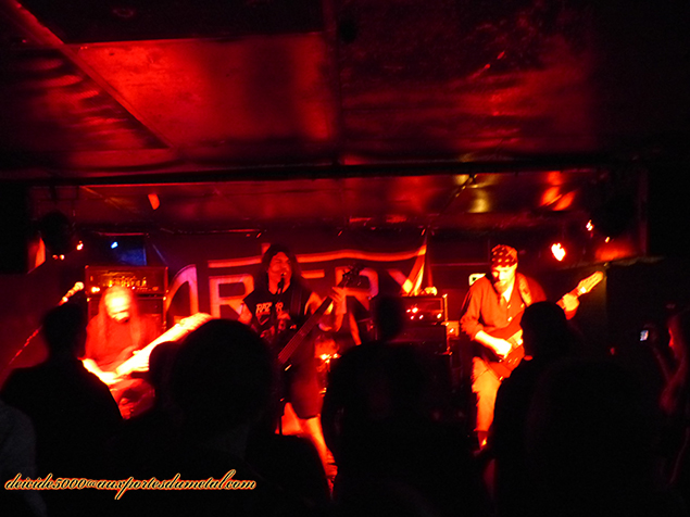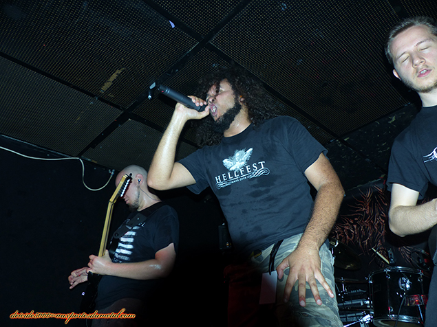 J’ai déjà vu les Heboïdophrénie à deux reprises. C’est du death de boeufs pas très chantant, plutôt sauvage et recommandé pour sécuriser son CAP de boucherie. Revenant d’une pause de huit mois environ après le départ de leur batteur dont le retour est toujours envisageable… ou pas. Enfin bref, ils semblent avoir trouvé un batteur qui fait globalement l’affaire. Pas facile pour lui, je me souviens avoir vu le batteur précédent galérer sur ses propres compos, challengé par les tempi rapides et leurs changements… alors on peut excuser le petit nouveau. Le groupe décoiffe et ne laisse plus que Loïc (chant) avoir les cheveux longs. Bastien le gratteux dernier arrivé en date, s’est levé le matin et a décidé de couper ses cheveux. Il est propret maintenant, façon gendre idéal, tant qu’on ne prend pas en compte ses grimaces. Quant à l’autre guitariste qui arborait de très longs cheveux avec une calvitie avancée, ben pareil, exit les cheveux longs. En fait, c’est le synchronisme avec le bassiste avec la boule à Z. Du côté musical, l’exécution est sympa, le son pas génialissime cependant. On a droit au célèbre Cadaver, titre facile à retenir car les grognements sont assez distinctifs.