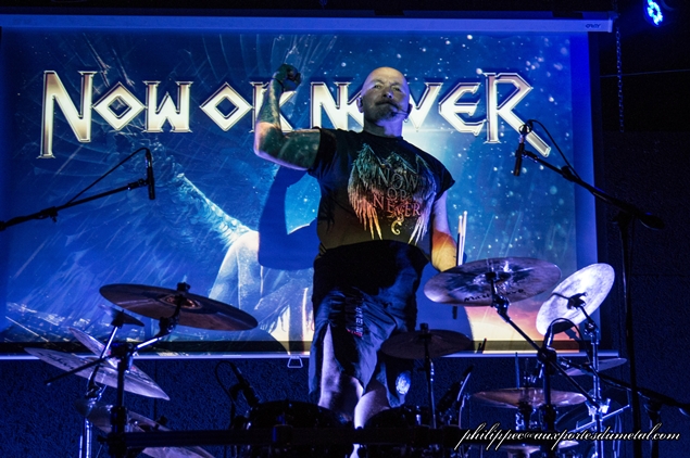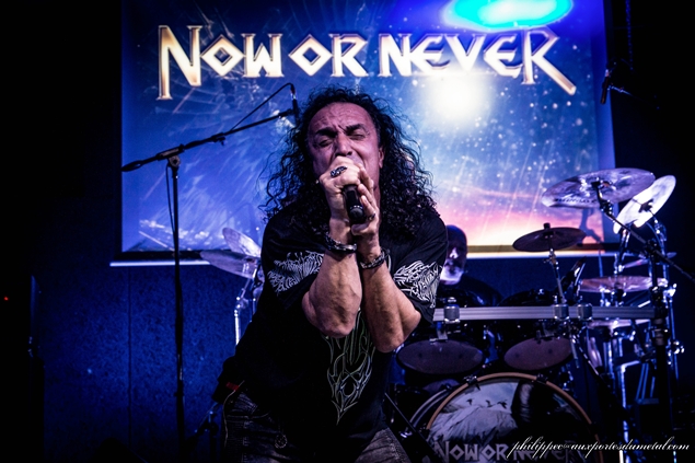 Après une courte intro fraîchement composée pour l'occasion, Now Or Never entre sur scène. Debout derrière sa batterie, Ranzo salue le public, le reste du groupe le suit puis entame le set avec Sonic Extasy puis I Shall Remain, deux brûlots extraits du nouvel album II sorti quelques jours avant. S'ensuit Reach Out For The Sky : sur le riff d'intro, Ricky joue au méchant et cela lui va bien. Même si le son n'est pas toujours au rendez-vous, Jo assure sur ce titre. Il est dommage que, collé à la scène, on ne puisse pas mieux l'entendre et que l'on soit obligé d'être au milieu de salle pour faire le constat de son talent !... Allez, on continue. Cela sent bon le Heavy Metal sur le brûlot éponyme Now Or Never, les cinq vétérans sont en mode warrior ! Si Jo Amore est un superbe chanteur, Ricky Marx est, lui, un sacré soliste.