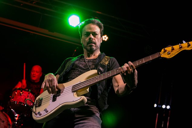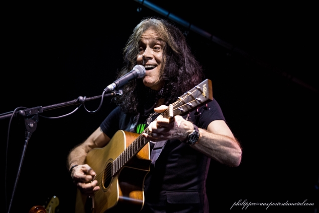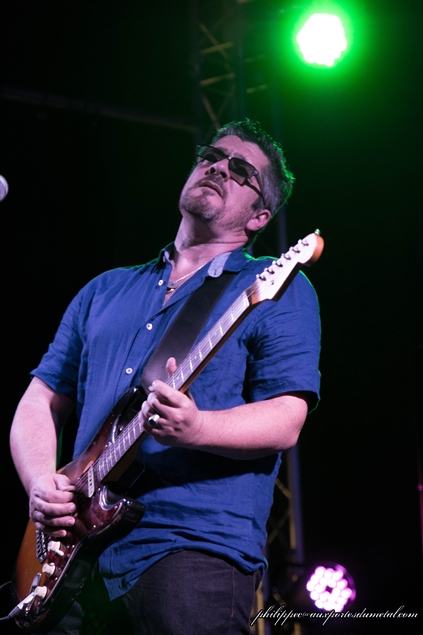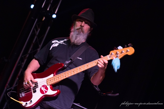 Pat n’a pas encore commencé qu’il est déjà tout sourire. C’est une constante chez cet artiste, et ça file déjà la banane. Son band est composé de Marty McDermott à la basse et de Paul Faloon à la batterie. Nous les avions déjà vus dans cette configuration lors de leur dernier passage au TribalFest de Peymeinade en 2014. On ne change pas une équipe qui gagne. Quand Pat attaque, le son de sa gratte est puissant (il joue sur Vintage électrique et acoustique, et une vieille Fender Stratocaster toute élimée), mais c’est un peu la consternation dans les premiers rangs. On n'entend pas du tout la voix ! C’est le batteur de LSB, qui vient manier une table de mixage située sur le devant de la scène pour essayer de régler le problème. Malheureusement, il ne sera jamais vraiment réglé et les deux micros, celui de Pat et celui de Marty, sont quasi inaudibles. Comme c’est Phlippe qui est aux objectifs, je peux reculer et essayer de trouver un emplacement où le son est meilleur, mais même en cherchant bien, c’est pas top. C’est vraiment dommage, et assez peu professionnel de ne pas avoir de vrai ingénieur son sur un concert comme ça. Je suis surpris. Va falloir faire avec, d’autant que Pat et son band sont à fond. Eux ont leurs retours dans les oreilles et visiblement tout va bien et ils enchainent les morceaux sans quasi aucun break : quelle santé ce Pat !