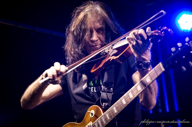 Je crois comprendre que le premier morceau est extrait de son tout dernier album, Blues Train to Irish Town, et c’est excellent, groovy à souhait. Ready To Rock, un incontournable, extrait de son premier album, est une tuerie et nous prouve que Pat ne lâche pas l’affaire, rocker il est, rocker il reste. Pat nous scotche dans nos bottes avec une première reprise de Gary Moore, Still Got The Blues. Quel pied ! Il met ensuite tous les anciens à genoux en jouant deux morceaux de l’époque Mama’s Boys, dont Runaway Dreams sur lequel il finit par lâcher sa guitare et jouer du violon qui était posé devant lui. Dommage mais là encore on voit bien le violon et surtout le pauvre archet qui perd ses plumes sous les fiddles furieux de Pat, mais on ne l’entend guère. C’est encore le batteur des LSB qui essaye de rectifier le tir. Du coup ca va mieux pour le morceau suivant qui est un vrai morceau de fiddle traditionnel irlandais. Ca met tout de suite une sacrée bonne ambiance, tout le monde est ravi sauf le pauvre archet tout ébouriffé.