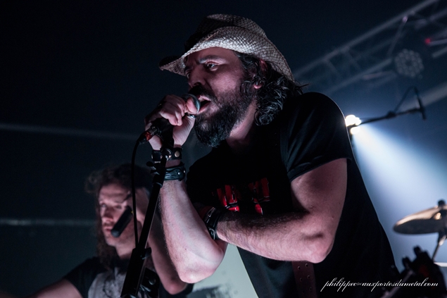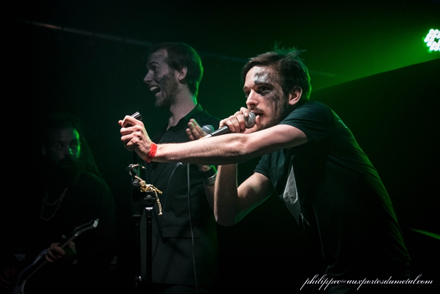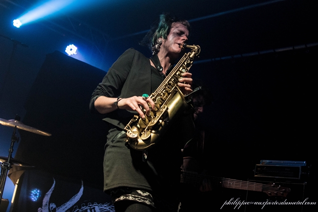 A peine le temps d’un cheese burger au foodtruck que c’est déjà l’heure de Baron Samedi. Je ne connaissais rien de ce groupe, mais ce que j’ai pu lire et écouter avant le concert a attisé ma curiosité. Le style est très original, une sorte de metal théâtral, croisement improbable de Hubert Félix Thiéfaine, Higelin, Ange voire Noir Désir avec les sons cuivrés des norvégiens de Shining, ou ceux déjantés et avant-gardistes des Canadiens d’Unexpect. Ils apparaissent sur la scène la face vaguement noircie. Le groupe est composé de Théo et Félix Roumier, certainement frères, respectivement guitariste et bassiste, de Raphaël Jamin à la batterie, de Léa Cuny-Bret au saxo alto et d’une paire de chanteurs/acteurs/déclameurs de poèmes, Victor Ginicis (qui d’ailleurs porte un t-shirt d’Hubert Flélix Thiéfaine, tiens donc…) et Pierre-Olivier Bellec.