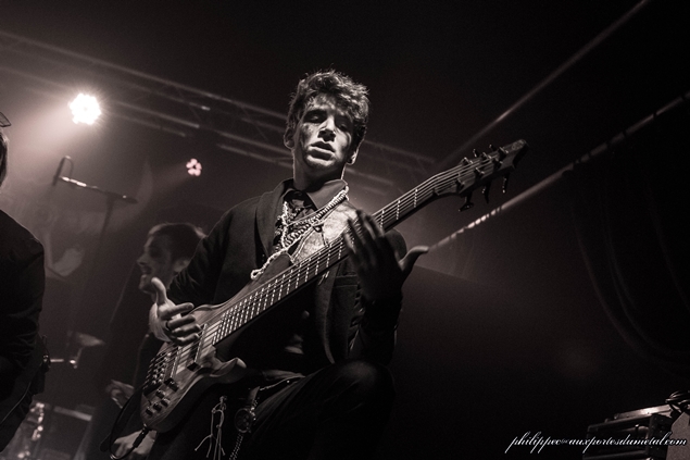 Théo et ses dreadlocks jusqu’au bas du dos assure bien à la gratte, en solo et en rythmique, souvent épaulé par Félix, qui peut jouer dans les aigus aussi. Il aurait quand même pu avoir un peu plus de son dans le mix, Le groupe joue deux extraits de leur premier album, sorti en 2014, Avant L’asphyxie : Les Yeux Clos et Sentence Electrique. La salle accroche instantanément. Les Yeux Clos résume bien la folie créatrice qui anime le groupe : saxo omniprésent, bonnes paroles travaillées (« des contentieux, des comptes en Suisse »), posées sur une ligne de chant originale. Sur l’autre ancien morceau, Sentence Electrique, Pierre-Olivier déclame des vers étranges dans lesquels il dénonce tout et n’importe quoi (lui-même à la fin). Ca a de la gueule.