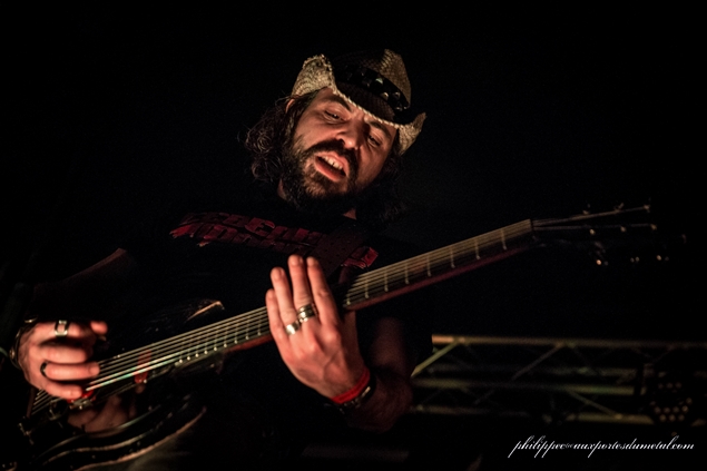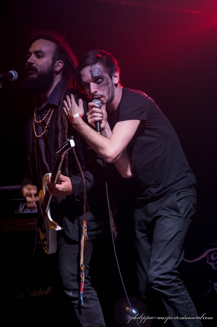 Le rôle de Pierre-Olivier est celui d’un conteur de vers, entre les morceaux ou en intro des morceaux. Le reste du temps il est plutôt en retrait, accroupi derrière le groupe. Il porte un costard, ce qui lui donne une allure complètement décalée. Il jouera aussi sur un clavier posé sur un ampli sur le côté de la scène. C’est Victor qui chante sur les morceaux. Lui aussi a une présence scénique très théâtrale. D’ailleurs sur leur site, on peut lire que les deux sont impliqués dans des projets artistiques divers et cross disciplines et notamment dans le théâtre. Le projet Baron Samedi et son Grand Carnaval a l’air d’être une autre manifestation artistique cross genre et elle surprend, en bien, le Rat’s. Car la musique est, comme le nom du groupe, assez étrange (Baron Samedi est un personnage du vaudou). Pas mal de changements de style, de styles de chants différents, rythmés par de très bonnes lignes de la grosse basse six cordes Ibanez de Félix. Le sax de Léa double souvent le chant et apporte un réel plus et surtout une signature originale au groupe. Le groupe avait lâché pas mal de ballons de baudruche dans la salle, mais la foule n’en fera pas grand-chose.