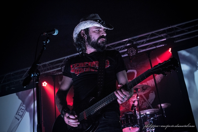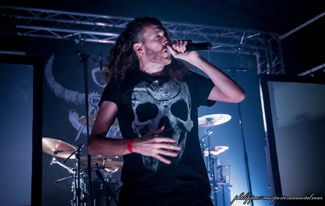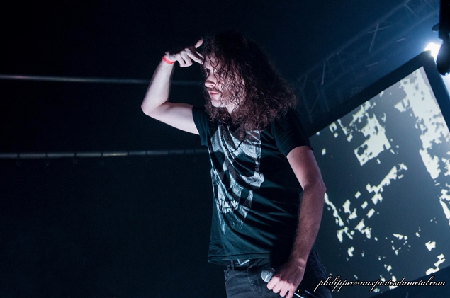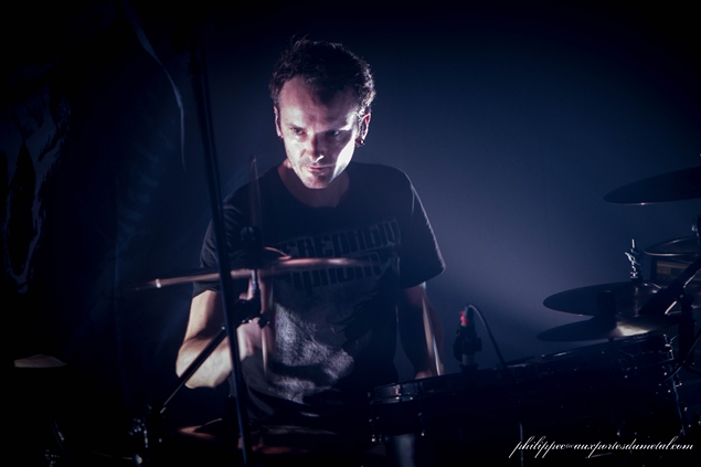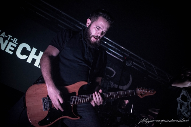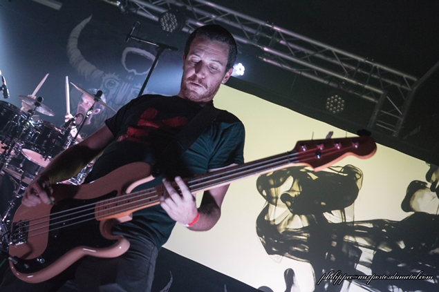 Ils quittent tous la scène en laissant Sam seul face à ses machines. Il nous réalise une excellent duo de batterie/samples accompagné par les écrans vidéo. Sur Walls of Shame, Didou lance un wall of death pour bisounours, c’est-à-dire en demandant de se faire des bisous à la rencontre des deux groupes. Ca se bouscule quand même pas mal, je ramasse un mec tombé à mes pieds. Devant moi, Benben est beaucoup moins dissipé et reste très appliqué pour assurer ses riffs acérés. Pendant ce même morceau, les écrans vidéo montrent des images noir et blanc d’une ville dévastée par les bombardements. Ca ressemble à ce qu’on a pu voir d’Alep.