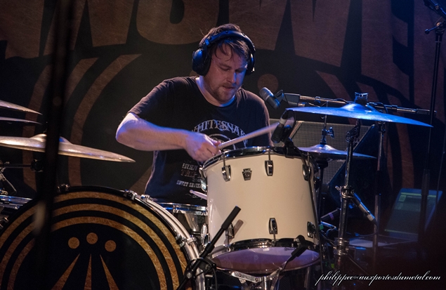 A côté de lui, Paul Mahon est toujours bigrement efficace avec sa LesPaul. A la basse, on retrouve Micky Waters, je remarque qu’il a changé son matériel pour une P-Bass Yamaha (au lieu de ses éternelles EPS noires). Derrière, c’est toujours James Heatley qui assure aux fûts. Il porte un casque la plupart du temps. Je ne sais pas s’il a les clicks dans son casque, mais ça me semble compliqué vu que souvent, ça n’est pas lui qui démarre le morceau. En tout cas il donne de sa personne et dégouline littéralement quand il s’agite.