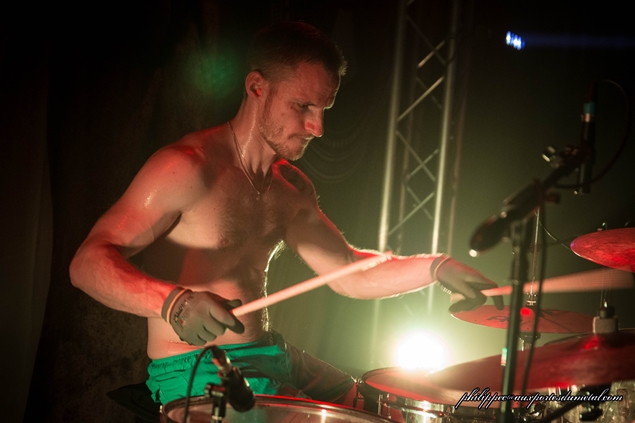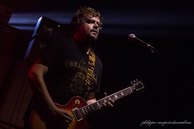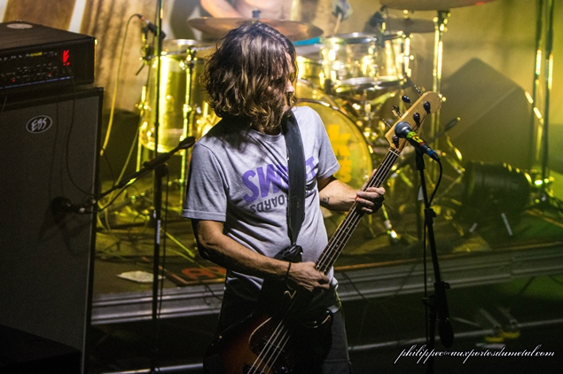 Le concert va crescendo dans son intensité, avec des morceaux plus pêchus des anciens albums. Et dans la foule ça monte aussi en puissance, ça n’est rien de le dire. Je vois un groupe de barbus (les mecs trendy, pas les autres), qui tentent de faire bouger le Rat’s en bousculant tout le monde. Ca finit par marcher pour les uns et agacer pas mal d’autres. Résultat, pas mal de monde recule un peu et abandonne la barrière aux furieux qui, à une dizaine, transforment le Rat’s en joyeux bordel. Les godasses volent, ça chute, ça pousse, ça casse même une des barrières derrière Phil qui tente de s’abriter pour faire encore de belles photos. Plusieurs mecs réalisent des slams en prenant appui sur la barrière. Casse gueule !
