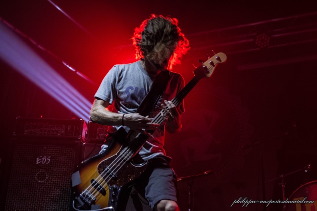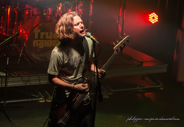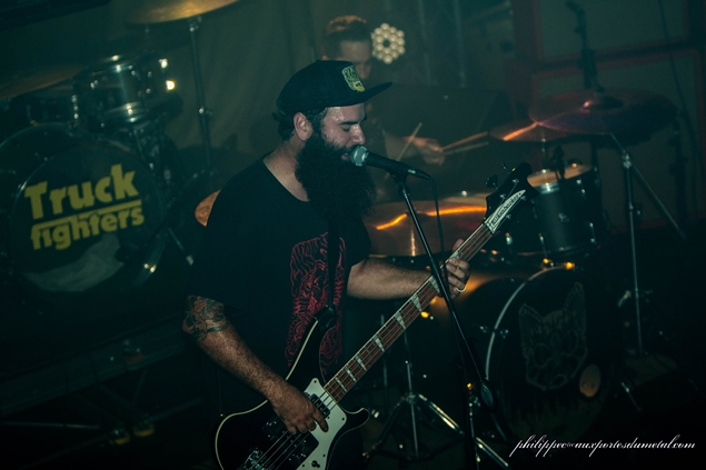 J’avais pu voir Truckfighters au Hellfest, peut-être bien deux fois même. Leur concert dans Valley m’avait laissé un excellent souvenir et convaincu de ne pas rater cette n-ième date au Rat’s qui devient petit à petit ma deuxième maison. Voilà nos trois compères sur scène. Ozo tient toujours sa Jazz bass de façon non académique, le manche presque vertical. Comme sa main gauche joue très bas sur le manche et sa main droite martyrise les cordes à coup de médiator, très haut, ses deux mains se rejoignent presque. En parlant de médiator, Phil qui traine toujours au bon endroit m’a dégotté un de ceux du bassiste. Eh bien purée de purée, j’aimerais pas être à la place de ses cordes. Le truc est un véritable bout d’os ! Tu m’étonnes que sa basse sonne sa mémé ! Bref ça c’est quand il s’énerve un peu mais le concert commence plutôt calmement avec un morceau qui porte bien son nom : Calm Before the Storm. Car il faut bien dire que c’est la spécialité du trio, les alternances de moment plutôt stoner lancinant et les moment hystériques qui incite au pogo (j’y reviendrai). Ozo, cheveux devant les yeux, grosses pattes sur les joues, ne bouge pas beaucoup, il est occupé vous me direz, chant et basse, certes.