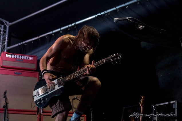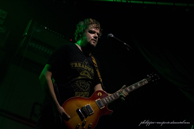 Witchrider et We Hunt Buffalo partagent leur batterie et les trois groupes de la soirée partagent les amplis, tout est bien optimisé (faut aussi que ça rentre dans la remorque du tourbus) et les changements de plateau sont assez rapide. Du coup quinze minutes plus tard, les trois canadiens de We Hunt Buffalo attaquent à leur tour. Je ne sais pas s’ils chassent vraiment les bisons dans leur contrées sauvages mais, à voir la dégaine et la grosse basse Rickenbacker du bassiste, on se dit qu’ils doivent pouvoir même chasser le bison à coup de basse. Le gars est impressionnant. Son nom est Brendan Simpson et ses deux acolytes sont Ryan Forsythe à la guitare et au chant et Brandon Carter aux fûts. A noter que j’aime pas mal la voix claire et assez haute de Ryan, mais par contre j’aime beaucoup moins le style gueulant de Brendan qui intervient régulièrement pour des chœurs et même quelques chants lead (sur We Praise Oysters – et malgré mon appétit en ce qui concerne les huitres) . Le style est totalement différent des Witchrider, comme quoi même dans un style donné, stoner, il y a des variations incroyables.