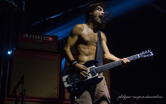 Du coup, les autres bougent pour lui. TBD, derrière ses fûts, n’arrête pas mais bien entendu, il reste collé à son siège. Par contre, Dango lui, se balade partout et bouge bien. Il saute, secoue la tête. Comme toujours, il utilise une unique Gibson manche traversant. Il assure les riffs (doublés souvent par la basse d’Ozo) et les petits leads dont le groupe a le secret. Ozo tente de nous apprendre à dire « merci beaucoup » en suédois. "Merci", on a capté, c’est « tak », la suite on devra s’en passer. A part ça, ils communiquent assez peu, ils nous remercient, mais semblent assez timides sur scène.