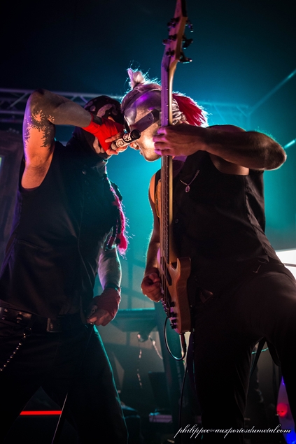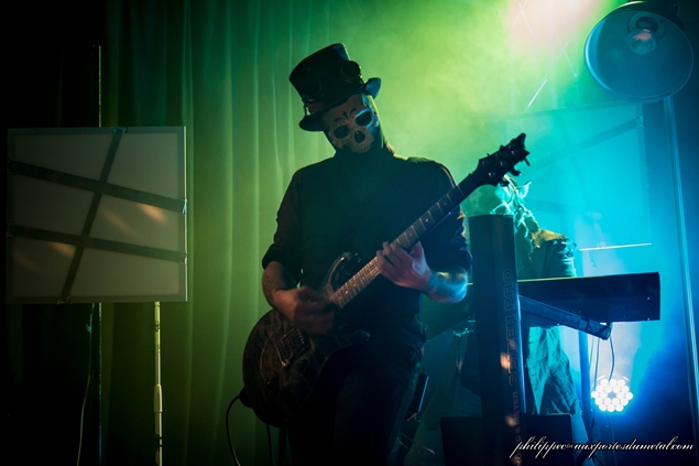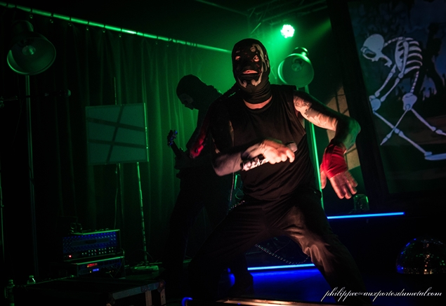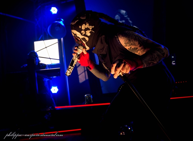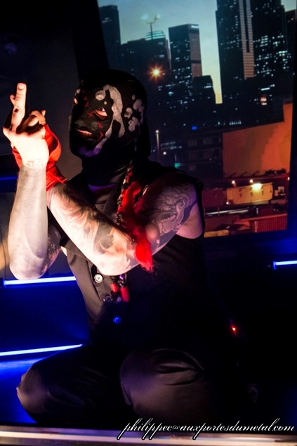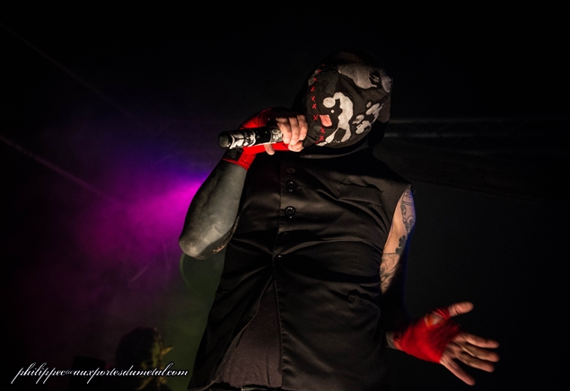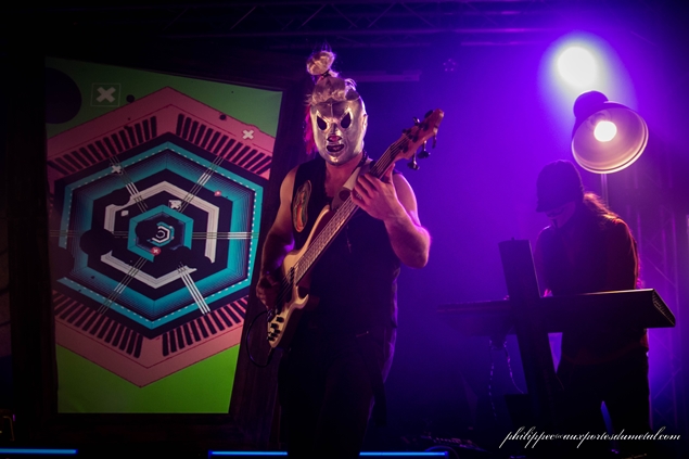 Il est environ 23h15 quand les lumières s’éteignent enfin. Les musiciens qui s’occupaient d’installer leur matos sur scène ont revêtu leur tenues de scène. Tous sont masqués, avec un masque Anonymous au clavier de droite, un masque de troll pour le clavier de gauche, un masque de squelette à la guitare, un de catcheur à la basse et un autre masque de catcheur au micro. Le tout fait évidemment son petit effet. Si je vous donne les noms des musiciens ça va peut-être vous aider ? Alors c’est Rorschach qui est au chant et au show, Niko à la guitare, S.A.D. à la basse, Howahkan Ituha et # (ben ouais !!) aux claviers et machines diverses.