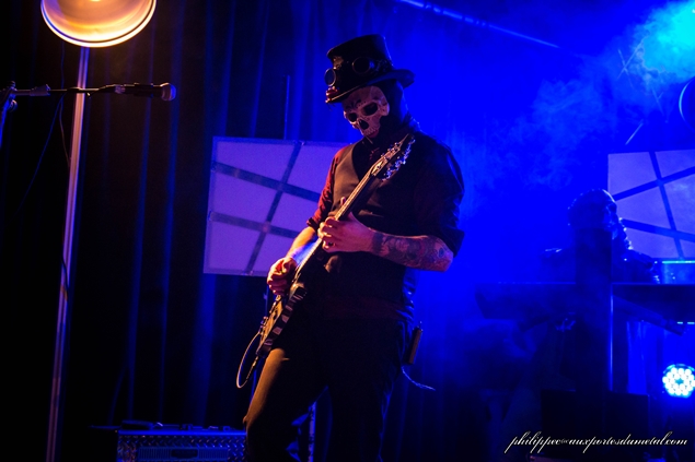 Rorschach est un vrai showman, il est théâtral, il joue avec sa tête, puis il passe derrière la batterie électronique pour l’intro tribale de The walking fed, il lance un circle pit, qui a la particularité d’être surtout animé par une horde de filles déchainées. Eh oui, avec 6:33, le spectacle n’est pas que sur scène ! Il descend ensuite carrément faire le pitre avec les spectateurs : il vient danser avec une petite fille d’une douzaine d’années, la plus jeune fan de ce soir, et il me pique mes lunettes de soleil qu’il enfile par-dessus son masque, avant de me les rendre en me les lançant. Quand il annonce le dernier morceau, nous lui répondons « hooooo », il faut dire qu’il est minuit quinze et que bon, ils ont commencé bien tard. Mais il prévient que c’est un morceau de … douze minutes. Sacré Rorschach ! Il profite aussi pour remercier le Rat’s et nous rappeler que nous avons beaucoup de chance d’avoir une salle comme celle-là.