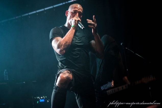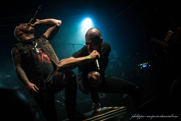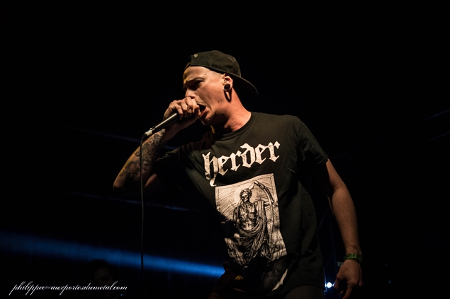 Le chant est un peu plus présent dans le mix, je ne suis toujours pas fan de ce type de chant, mais je me laisse prendre au jeu très énergique du groupe qui demande à tout le monde de se rapprocher histoire d’en prendre vraiment plein la gueule. Le jeu de guitare est beaucoup plus simple, plus indus bien souvent, avec peu ou pas de solo (peut-être est-ce dû au fait qu’un guitariste manquait à l’appel, je ne saurais dire, ne connaissant pas du tout la musique du groupe). Le bassiste joue assez saturé, il tourne sur lui-même et grimpe sur une des mini estrades placées sur le devant de la scène. Ca chahute un peu dans la salle, et les deux chanteurs font tout pour emballer la petite foule. Ils nous expliquent aussi que leur nouvel album est pour bientôt et d’ailleurs la setlist est déjà bien orientée vers ce nouvel album puisque à part trois titres (Litany, Orgasmophobia et Recurrence) et la reprise de Slipknot (People=shit), tout le reste en est extrait. Ils terminent leur set dans une très bonne ambiance.
