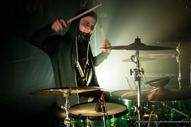 Donc pas facile de se prononcer sur son nom [renseignement pris, il s’agissait de Jiben alias Benjamin Daveyan et c’est donc Jeremy Lagrabe dit Mirfin qui manquait à l’appel]. D’autres membres apparaissent partiellement masqués, comme Thibault Boussac dit Boti, à la basse, qui porte un masque néoprène qui lui couvre le bas du visage et Florent Marzais le batteur (et fondateur du groupe) dont le bas du visage est peint en noir. Tout ce petit monde, par ailleurs gribouillés de noir, n’est pas venu là pour faire du tourisme et dès les premières mesures, ils mettent le feu à la petit foule du Rat’s.