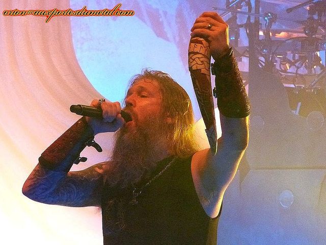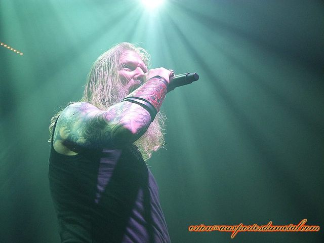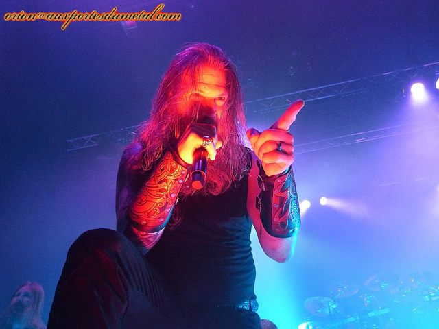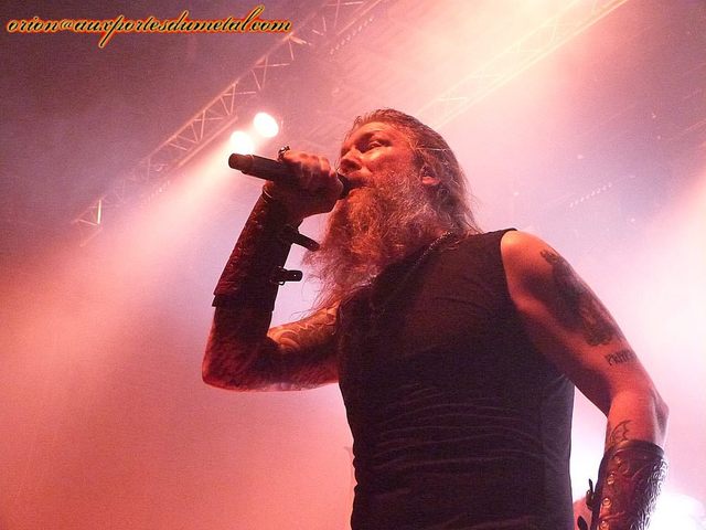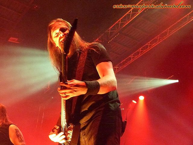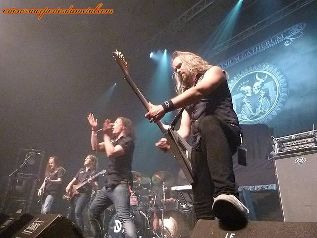 C’est donc à Omnium Gatherum que revient la tâche de chauffer la salle. Tâche dont les Finlandais vont s’acquitter avec les honneurs. Le groupe ne semble pas être connu de grand monde dans la salle mais la sauce prend et en quelques titres, une bonne partie du public présent (la salle n’est encore qu’à moitié remplie à ce moment-là) répond aux sollicitations du chanteur. Ils n’ont pas une place énorme sur scène car tout l’attirail d’Amon Amarth déjà installé derrière occupe les trois-quarts de la scène. Le son, d’où je suis, ne semble pas génial. On n’entend absolument pas le synthé. Je ne connais pas spécialement le groupe (j’ai entendu des morceaux par ci par là mais je ne possède aucun album) mais je dois dire qu’on se laisse facilement capturer par leur musique. On sent également leur professionnalisme. Trente-cinq minutes plus tard, le groupe quitte la scène sous les acclamations. Désolé pour la setlist mais le groupe joue sans, donc il m’est difficile de vous dire ce qu’ils ont joué.