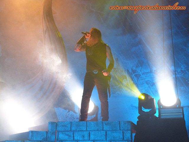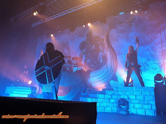 Place aux héros de la soirée, Amon Amarth. La scène est sympa, un gros casque viking sur lequel repose la batterie trône au centre avec un escalier de chaque côté. Ils attaquent par Pursuit Of Vikings et évidemment, ça chauffe le public d’entrée, qui reprend la mélodie du riff avec des "Oh oh oh oh oooh". Ca commence fort.
