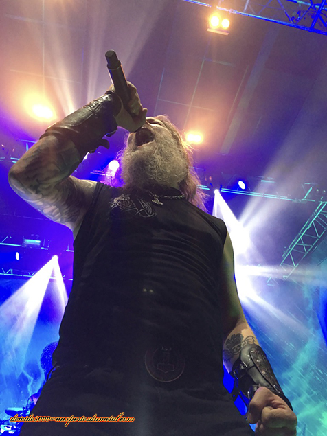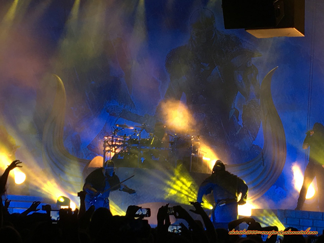 Il est 21h30, le drakkar accoste juste devant nous. Eh non, l’image est bonne mais il n’y a plus de drakkars dans le décor des Suédois (souvenez-vous des proues effrayantes de la tournée 2013-2014). Amon Amarth bénéficie d’un accueil des plus chaleureux. La scène est somptueuse. La batterie est juchée sur une espèce de gros casque à cornes, illuminé par les yeux. La bannière avec le jomsviking (sorte de mercenaire) de la pochette de l’album du même titre remplit l’espace arrière.