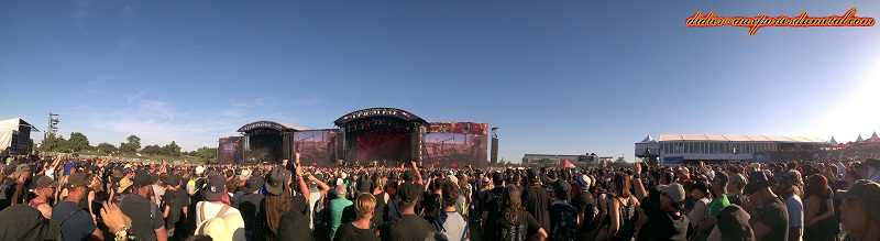 Dans l'espace festivaliers, la grande roue est toujours là, l'animation tyrolienne de l'année dernière a disparu, exit aussi le skate park remplacé par la zone à brumisateur. Les décorations sont toujours magnifiques, notamment le soir quand les feux illuminent tout le site. La zone devant les Mainstages a été élargie, on respire. C'est le top. Je suis allé plusieurs fois en Valley, une fois en Altar (pour Pain Of Salvation) et j'ai tenté d'accéder à la Warzone pour Suicidal Tendendies. C'était blindé. Mon spot de prédilection aura été devant les Mainstages, on ne se refait pas.