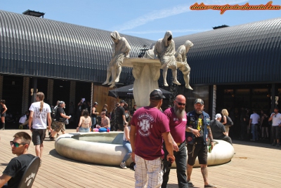 Puisque nous avons le plaisir d'avoir des entrées Presse fournies par notre partenaire privilégié, laissez-moi vous présenter aussi l'expérience côté VIP/Presse. Ca commence par un couac, le premier matin, car nous voilà bloqués sous le porche en forme d'Ampli Orange (les festivaliers rentrent par un porche en forme d'ampli Marshall). Le responsable explique que ça va ouvrir dans trente minutes. Bon. Mais il répète ça toutes les quinze minutes, et ça commence à gueuler, d'autant que du côté de la cathédrale, on a lâché les fauves. Pas les VIP/Presse. Par contre, ça m'a permis de comprendre que le statut de VIP s'achète, en plus du ticket, lorsque les badges Presse sont fournis aux professionnel (ou assimilés). Du coup, ces VIP, qui ont payé pour l'être, deviennent insupportables, quand le vigile continue de leur bloquer l'entrée. Ils ont payé plus cher, on peut les comprendre aussi. Ils voulaient, par ce truchement, accéder au stand merchandising avant le bas-peuple : c'est raté ! Ca me fait marrer. C'est un peu désorganisé quand même car les vigiles ne savent pas vraiment l'heure d'ouverture et le tout donne une impression de désorganisation. Quand finalement on lâche les VIP dans le nouvel espace, plus à l'écart des Mainstages, c'est le choc. Un jardin, des fontaines, une cascade, des mini plans d'eau qui au fur et à mesure de l'avancée du week-end (et de l'évolution des températures) vont se transformer en piscine à faire barboter des métalleux poilus ou des métalleuses dénudées.