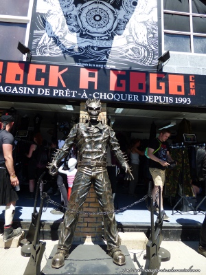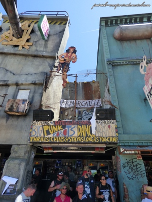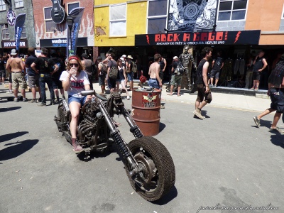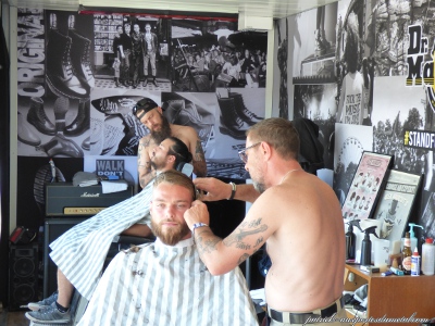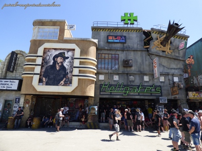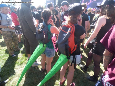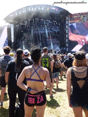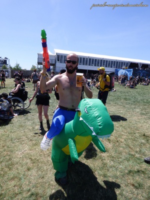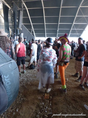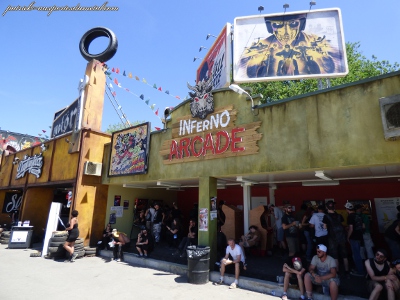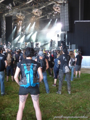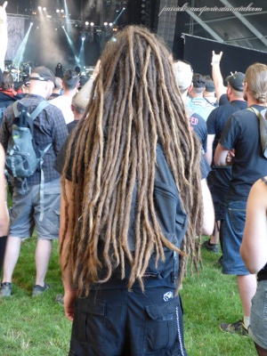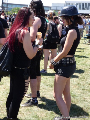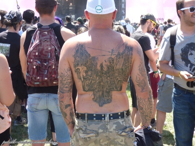 Côté population, je note toujours plus de filles présentes sur le site (et amatrices de slam). Je remarque que sur site, les tabous tombent et on s'expose. Tatouages magnifiques, coiffures improbables, tenues incroyables, et même seins à l'air (je veux dire se balader torse nu, pas juste monter sur les épaules de son mec pour montrer ses seins aux caméras pendant le set de Steel Panther). On remarque aussi les "touristes" du samedi, c'est de bonne guerre. Pas mal de gosses (pas à leur place à mon avis) envahissent les lieux le samedi après-midi. Cette année, ils viennent y voir Deep Purple et Aerosmith. Normal.