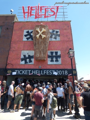 Pas loin de MainStage 1, il y a le stand merchandising des groupes, l'espace est assez sympa, avec trois murs de présentation. Le souci est que les gens, à la recherche de la moindre parcelle d'ombre se sont incrustés dans l'espace, laissant de moins en moins de place aux gens qui voulaient accéder au stand. Dommage aussi que, eux, ne prennent pas la carte bleue. C'est toujours un plaisir de parcourir l'Extreme Market, même si il y fait une chaleur accablante. C'est difficile pour les clients, mais surtout pour les exposants qui y passent trois jours suffocants. C'est pas cool pour ceux, nombreux, qui proposent des vinyles. Ca n'aime pas beaucoup la chaleur, ces petites bêtes. En plus il y a des endroits où le soleil rentre par le plafond, obligeant les exposants à protéger leurs rayons avec des bâches comme ils le peuvent. Clairement, le confort de cette tente mériterait d'être amélioré. Ca ne m'a pas empêché de me trouver quelques vinyles, souvenirs de ma jeunesse. A la sortie, pas loin du Market, le stand Muscadet du pays fait le bonheur des festivaliers. Que ce soit pour la consommation sur place, ou pour ramener en souvenir liquide, les cartons défilent. Toujours dans le Market Square, on trouve les habituels boutiques Doc Martens, Woodbrass mais aussi un barbier et un tatoueur. L'ambiance y est franchement sympa tout le long du weekend. Nous y sommes arrivés tard le jeudi, et il y avait encore un groupe qui jouait, ainsi qu'un ring de catch mais nous avons raté l'animation. Le stand Billet de 2018 est pris d'assaut, comme chaque année.