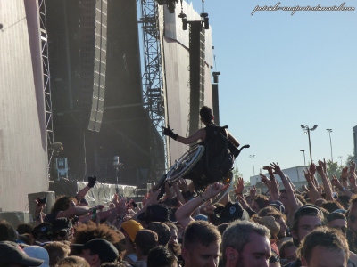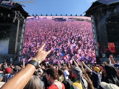 En parlant de caméra, il faut parler des trois écrans géants qui encadrent cette année les deux Mainstages. Que dire ? Fabuleux de luminosité, de taille (jamais vu aussi grand). On comprend mieux certains festivaliers qui privilégient le confort pour ce caler plus loin, être moins oppressé et suivre les concerts sur les écrans. C'est encore Arte qui filme, et balance les images, dont certains sont dispo en live sur le Web de la chaine, et seront dispo en replay. Ca fait une très grosse différence de confort cette année. Et puisque j'en suis au confort, je dois aussi signaler que le niveau sonore pendant tout le festival a été fortement amélioré et diminué. Je n'ai pratiquement pas porté de bouchons cette année, impensable encore l'année dernière. Seuls certains groupes (DevilDriver par exemple) poussait le potard sur 11. Pour les autres, c'était le top. C'est au final la meilleure amélioration, de mon point de vue, de cette douzième édition.