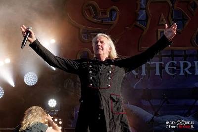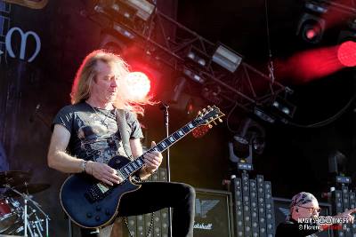 J'adore ce groupe que je n'ai encore jamais pu voir sur scène. Je m'étais jusqu'alors contenté de l'excellent DVD du concert du Z7 en Suisse en bavant. Forcément je me pose aux premières loges, face à la Mainstage 2. La chaleur est accablante dans la foule mais aussi sur scène. On peut voir que Ronnie, le chanteur, souffre mais c'est surtout Ken le guitariste qui doit sacrément avoir du mal entre sa tenue inadaptée (veste) et son embonpoint. Outre Ronnie au chant qui est déchaîné, le bassiste du groupe, René, abat aussi beaucoup de boulot scéniquement. Le son est bon et le groupe alterne des morceaux de leur dernier album Kingmaker et des anciens que la foule connait par cœur. Je suis ravi de leur fin de set puisqu'ils enchainent Little Drops of Heaven avec Future World, ce sont deux super morceaux d'époques différentes. La foule répond bien à Ronnie. J'ai pu les voir dans l'après midi traîner dans la VIP/Presse zone entre deux interviews que bizarrement on ne nous a pas proposé. Dommage.